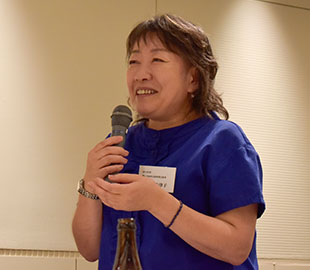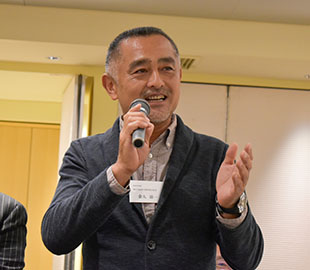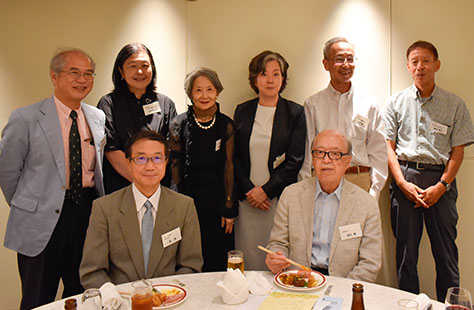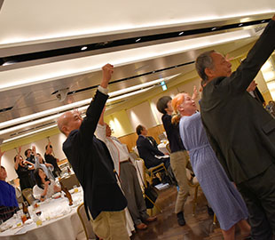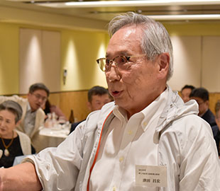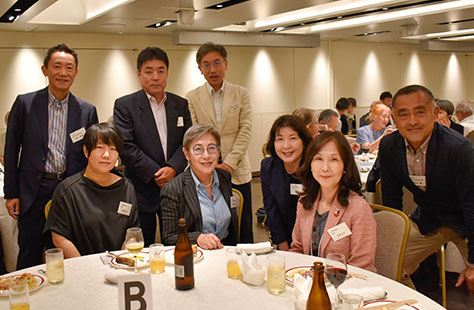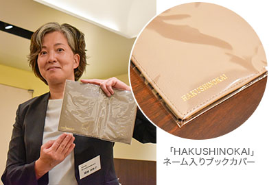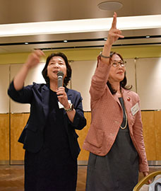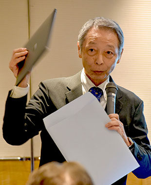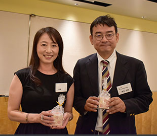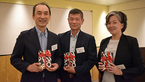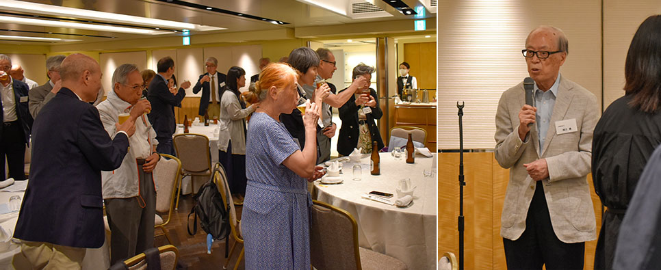 第2部冒頭の乾杯のご発声は、長年にわたり生涯学習開発財団をサポートして来られた、公認会計士の滝日徹先生。本支援事業が創設されたいきさつもお話しくださいました。峯村MCによる突撃インタビューには、どの参加者も人前で話すことは経験豊富で、研究の一端をうまく答えておられました。前回に引き続きじゃんけんゲームも行われ、勝ち残った方には、財団特製「HAKUSHINOKAI」ロゴ入りのブックカバーが贈呈されました。
