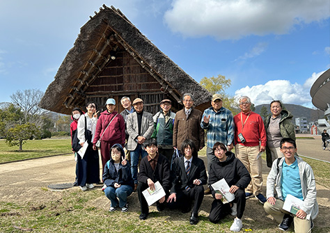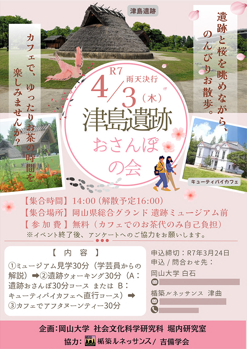 3回目の調査結果をベースにして生涯学習&お散歩の会を、大学研究室堀内教授・元岡山大学学長の槇野名誉教授率いる楯築ルネッサンス、吉備学会と共同で企画開催した。参加者は、学芸員の解説付きで遺跡ミュージアムなどを見学。その後、津島遺跡を散策するなどしてカフェに合流し、最後はアフタヌーンティーを楽しみながら交流を深めた。